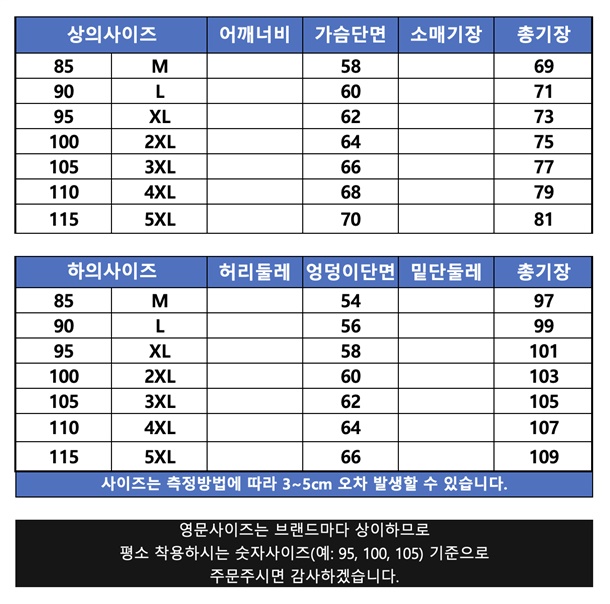 85(M),90(L),95(XL),100(2XL),105(3XL),