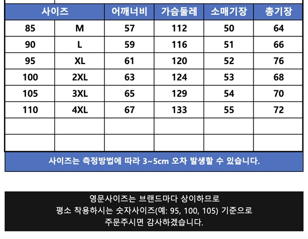 85(M),90(L),95(XL),100(2XL),105(3XL),110(4XL)
