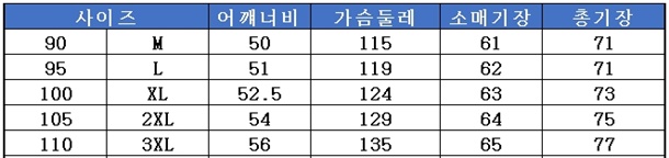 90(M),95(L),100(XL),105(2XL),110(3XL)